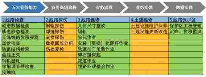 在轨道运维业务中,,,,,,,,,,,我们形成了完整的从业务能力(业务域)-业务流程-业务实体-数据模型的分析梳理过程。。。。。。。。。轨道运维业务能力如下图所示:::::::::::::